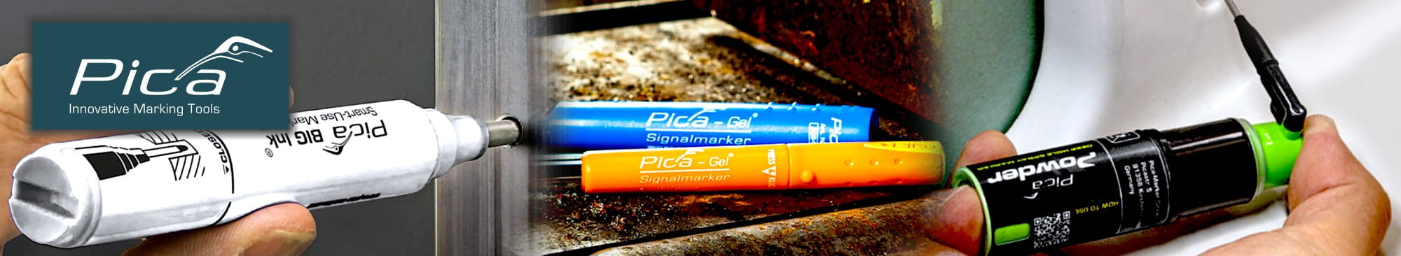Pica also offers the robust fast, efficient weatherproof, light resistant and high contrast 8 mm tip Gel opaque permanent marker ready to write on any surface. Especially rusty or oily, chloride-free metal applications at up to 1000°C temperature. The Pica Visor crayon marker is a refillable and resource-saving never-fade rich-contrast long life civil engineering and industrial marker ideally suited for rough or wet outdoor surfaces in areas with a lead that never dries out. And the Pica Dry long-life automatic pencil offers an extensive range of leads ready for almost any material surface.